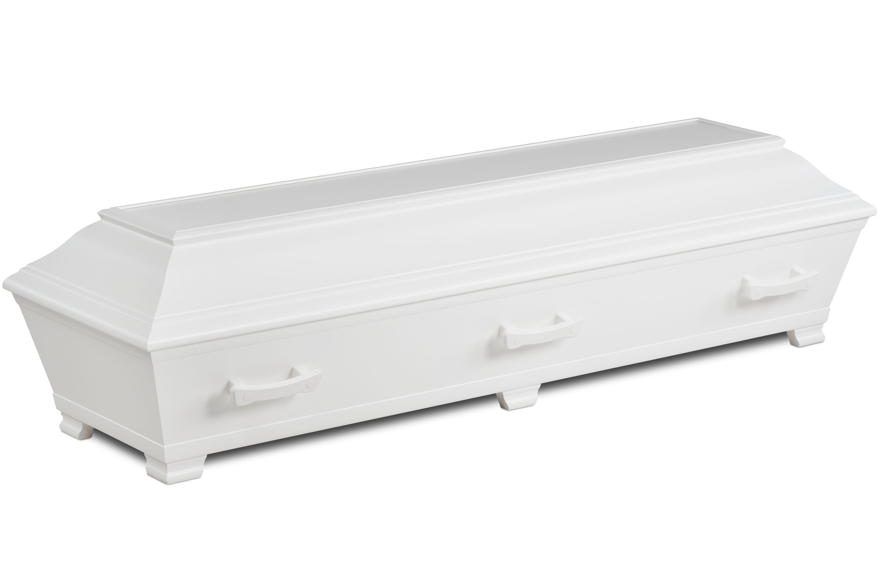 Elegant kista som är lackad i vit, svart eller valfri NCS-färg. Inredning bestående av av kudde och täcke med överlakansflik i linnekvalitet. Madrass i nonwoven-textil. Lock- och sidoklädsel i bomullstyg. I inredningsbilden används lockstöd.