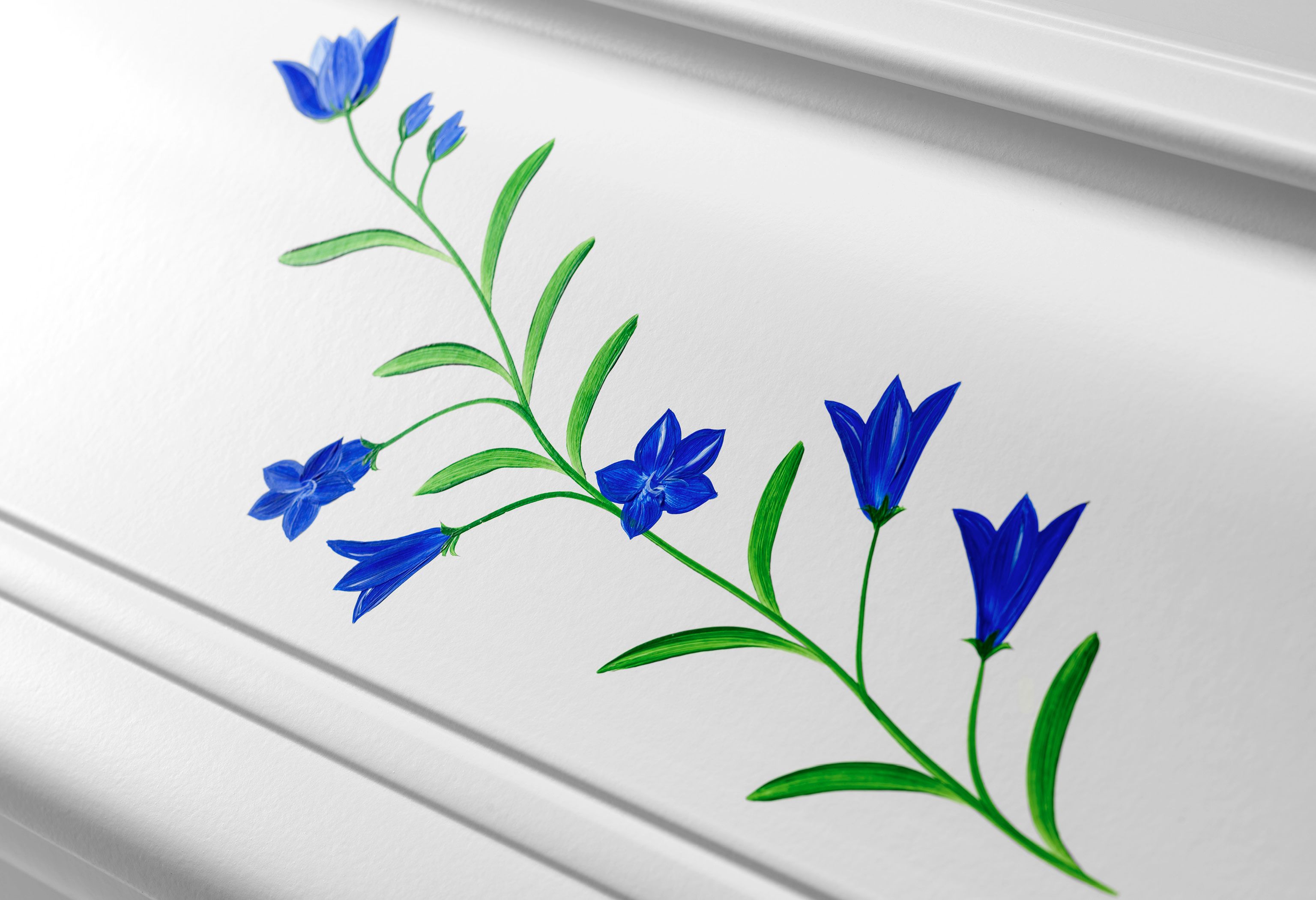 Vitlackad kista med vackert handmålat motiv av blåklocka. Inredning bestående av av kudde och täcke med överlakansflik i linnekvalitet. Madrass i nonwoven-textil. Lock- och sidoklädsel i bomullstyg.