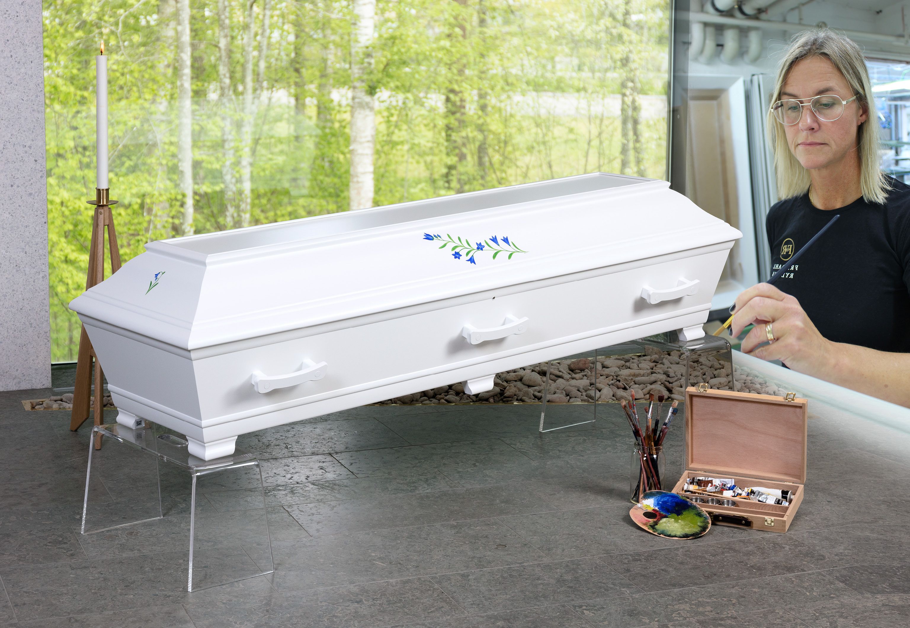 Vitlackad kista med vackert handmålat motiv av blåklocka. Inredning bestående av av kudde och täcke med överlakansflik i linnekvalitet. Madrass i nonwoven-textil. Lock- och sidoklädsel i bomullstyg.