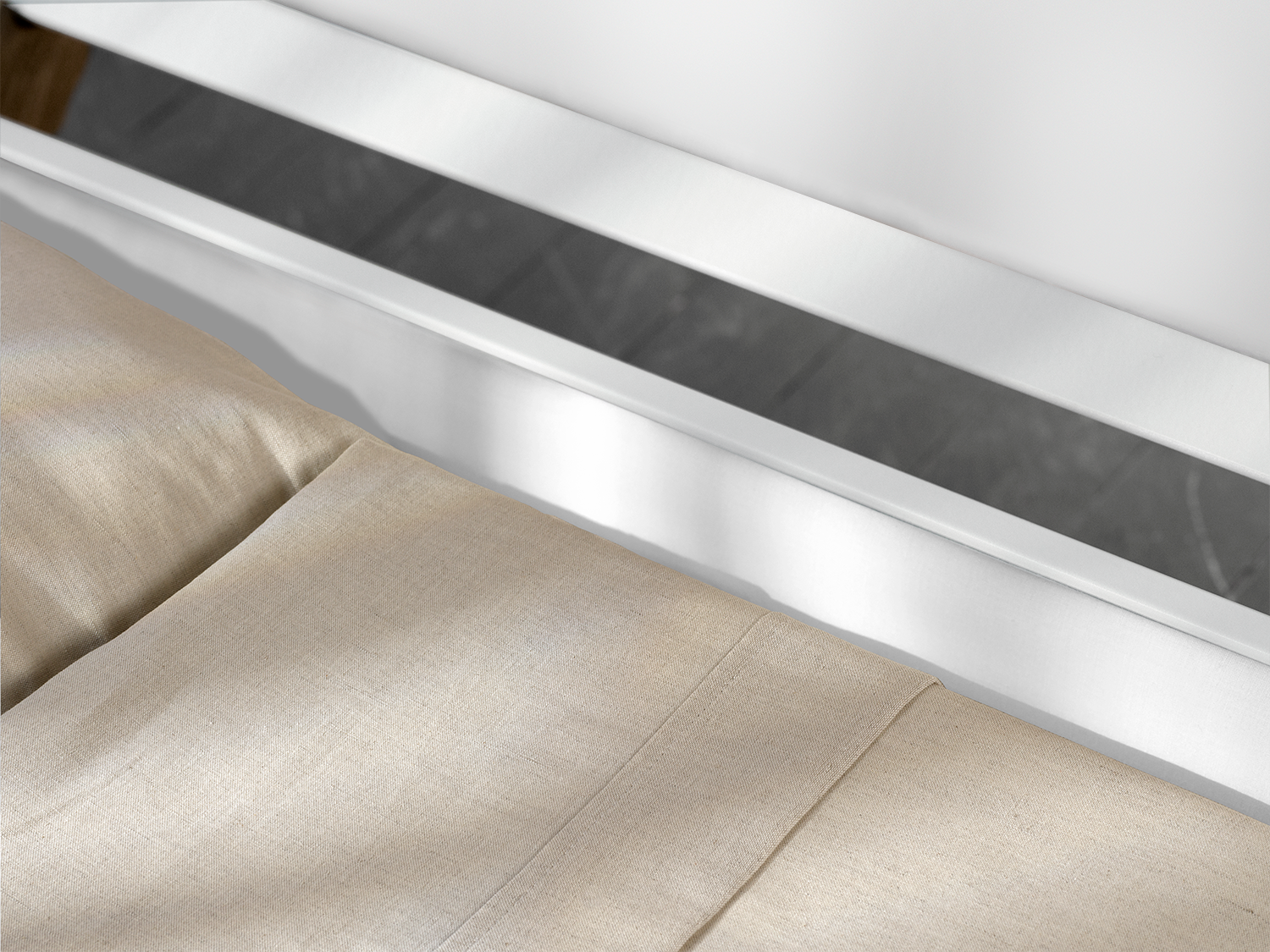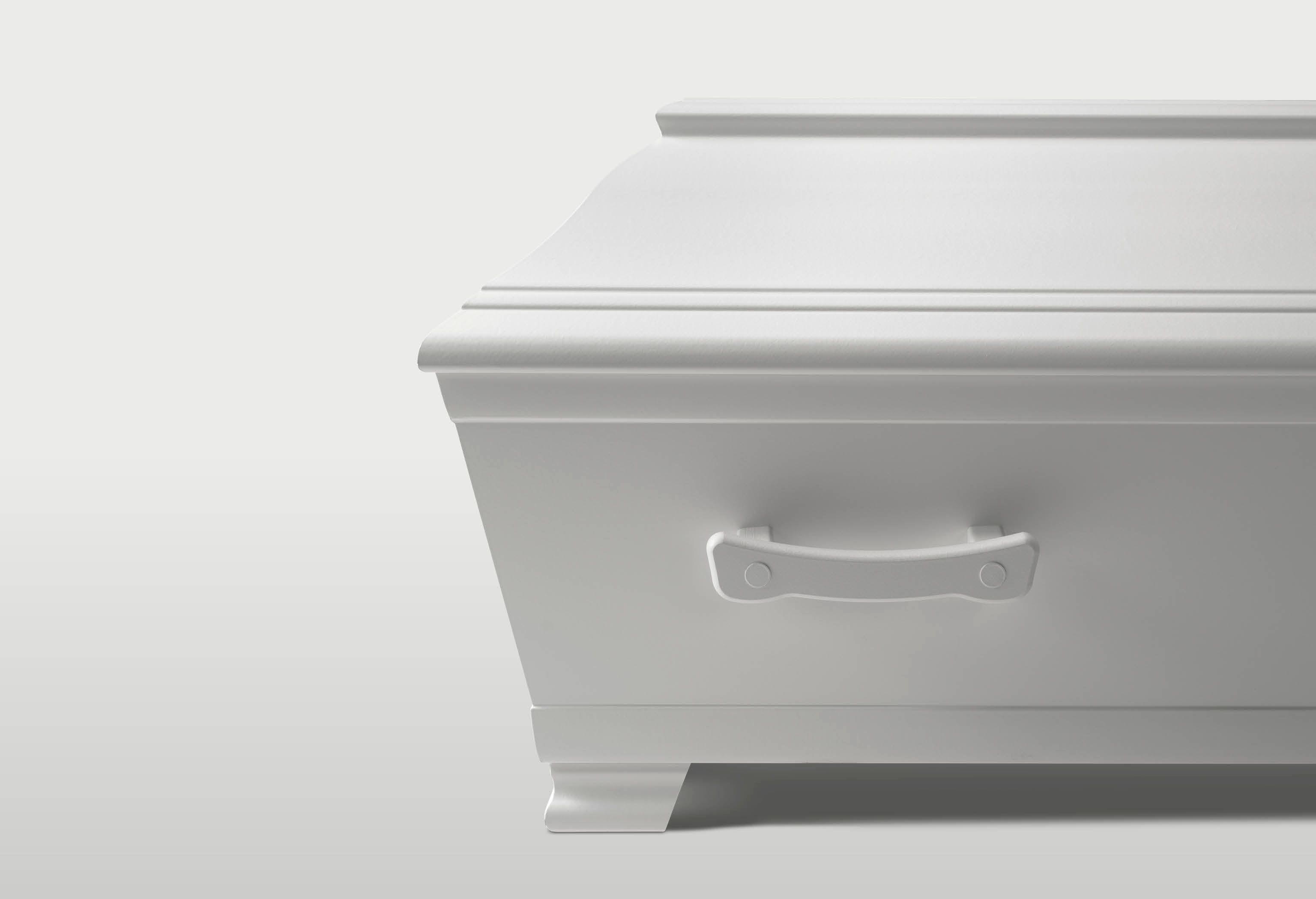 Elegant kista som är lackad i vit, svart eller valfri NCS-färg. Inredning bestående av av kudde och täcke med överlakansflik i linnekvalitet. Madrass i nonwoven-textil. Lock- och sidoklädsel i bomullstyg. I inredningsbilden används lockstöd.