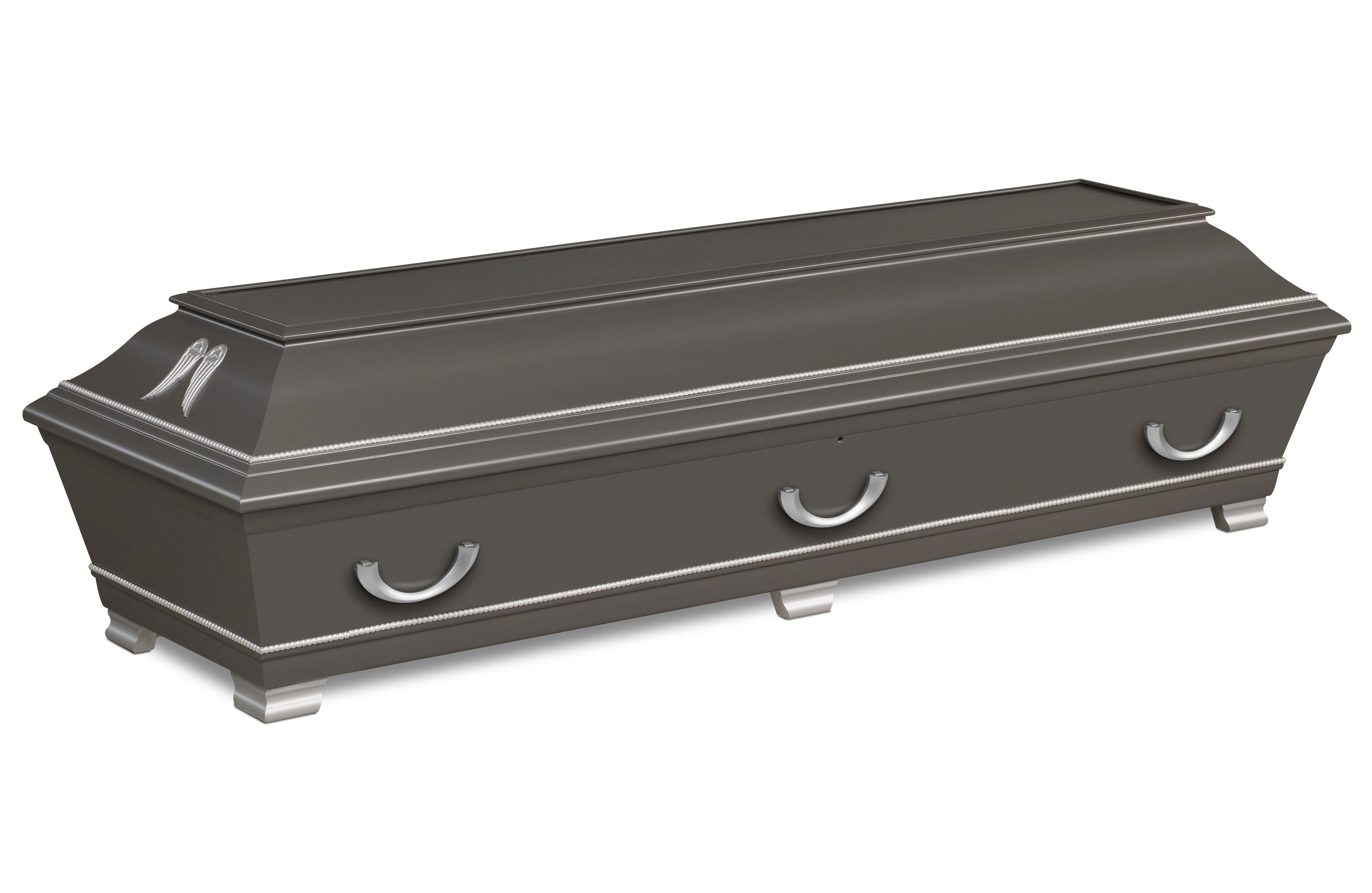 Elegant vitlackad kista med löstagbara änglavingar och vacker gulddekor på lock och botten. Inredning bestående av av kudde och täcke med överlakansflik i linnekvalitet. Madrass i nonwoven-textil. Lock- och sidoklädsel i bomullstyg.