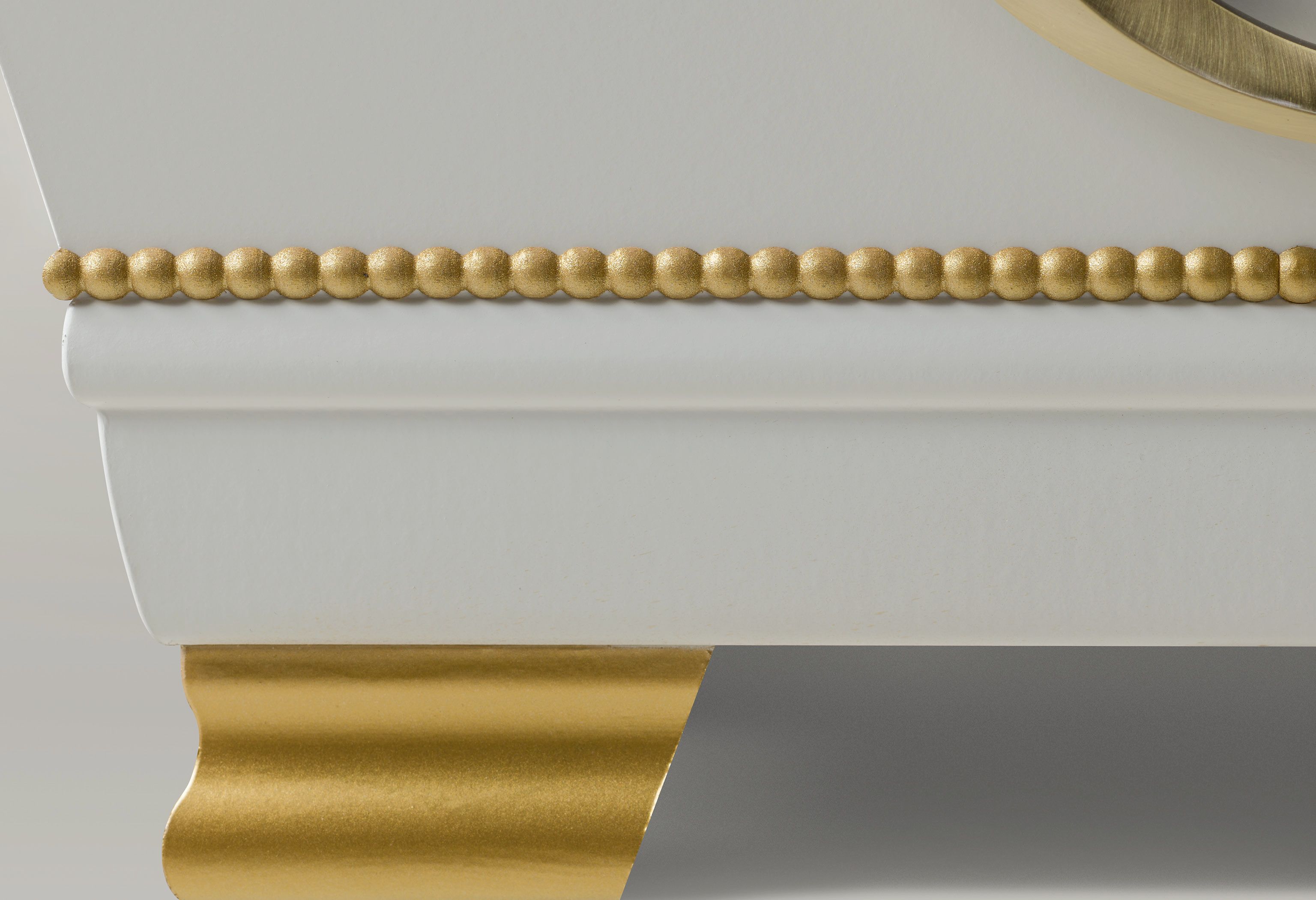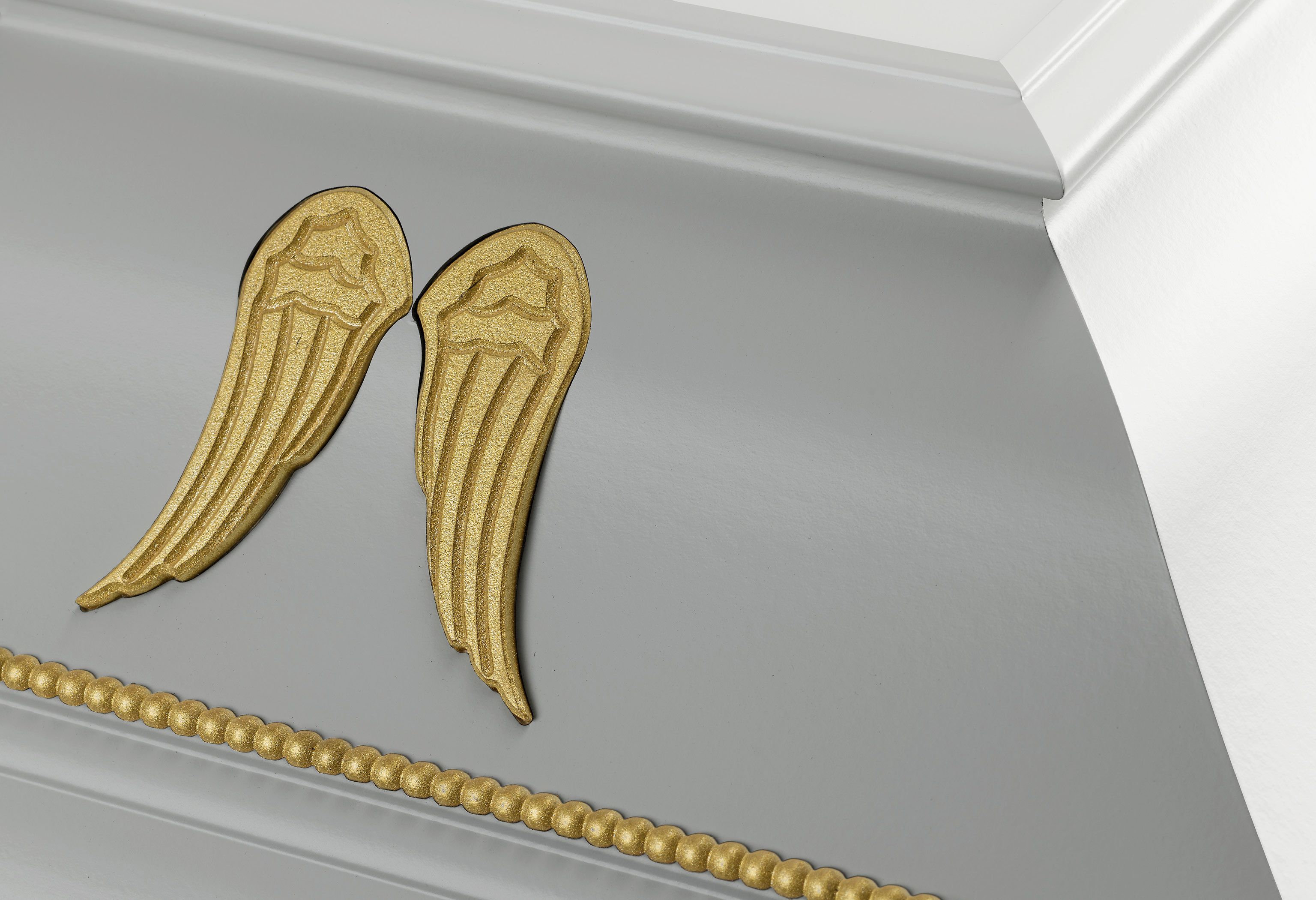 Elegant vitlackad kista med löstagbara änglavingar och vacker gulddekor på lock och botten. Inredning bestående av av kudde och täcke med överlakansflik i linnekvalitet. Madrass i nonwoven-textil. Lock- och sidoklädsel i bomullstyg.