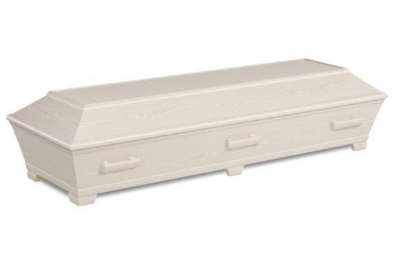 Stilren folierad kista av spån- och MDF-skiva. Tyginredning i form av madrass, kudde och täcke med överlakansflik i bomull. Sidoklädsel av mönsterpressat pappersmaterial. Oklätt lock.