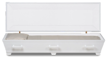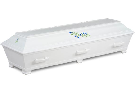 Vitlackad kista med vackert handmålat motiv av blåklocka. Inredning bestående av av kudde och täcke med överlakansflik i linnekvalitet. Madrass i nonwoven-textil. Lock- och sidoklädsel i bomullstyg.