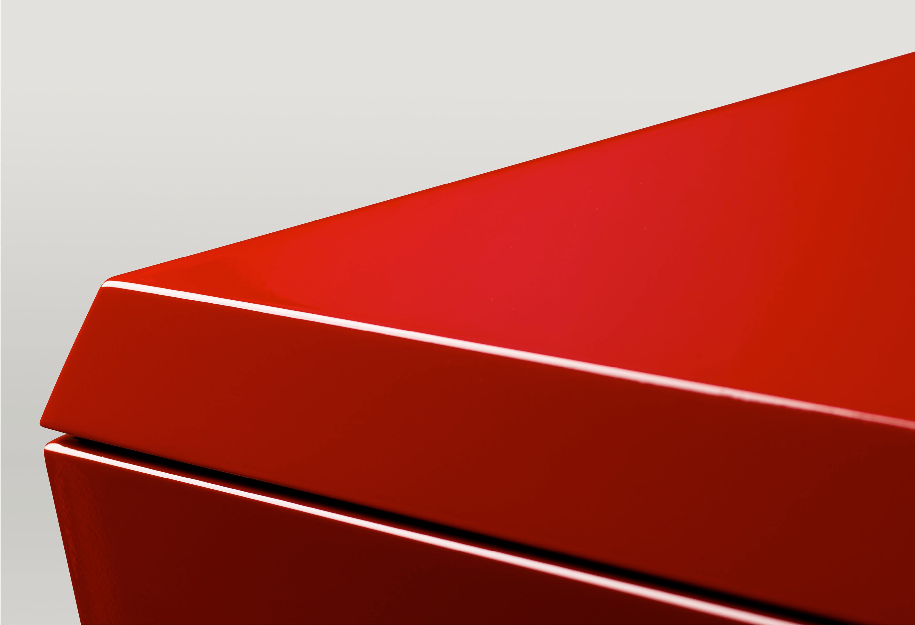 Exklusiv designkista av björkplywood i exklusiv lack. Finns som högblank i röd, svart och vitt. Sidoklädsel med ängsmotiv. Tyginrett lock.