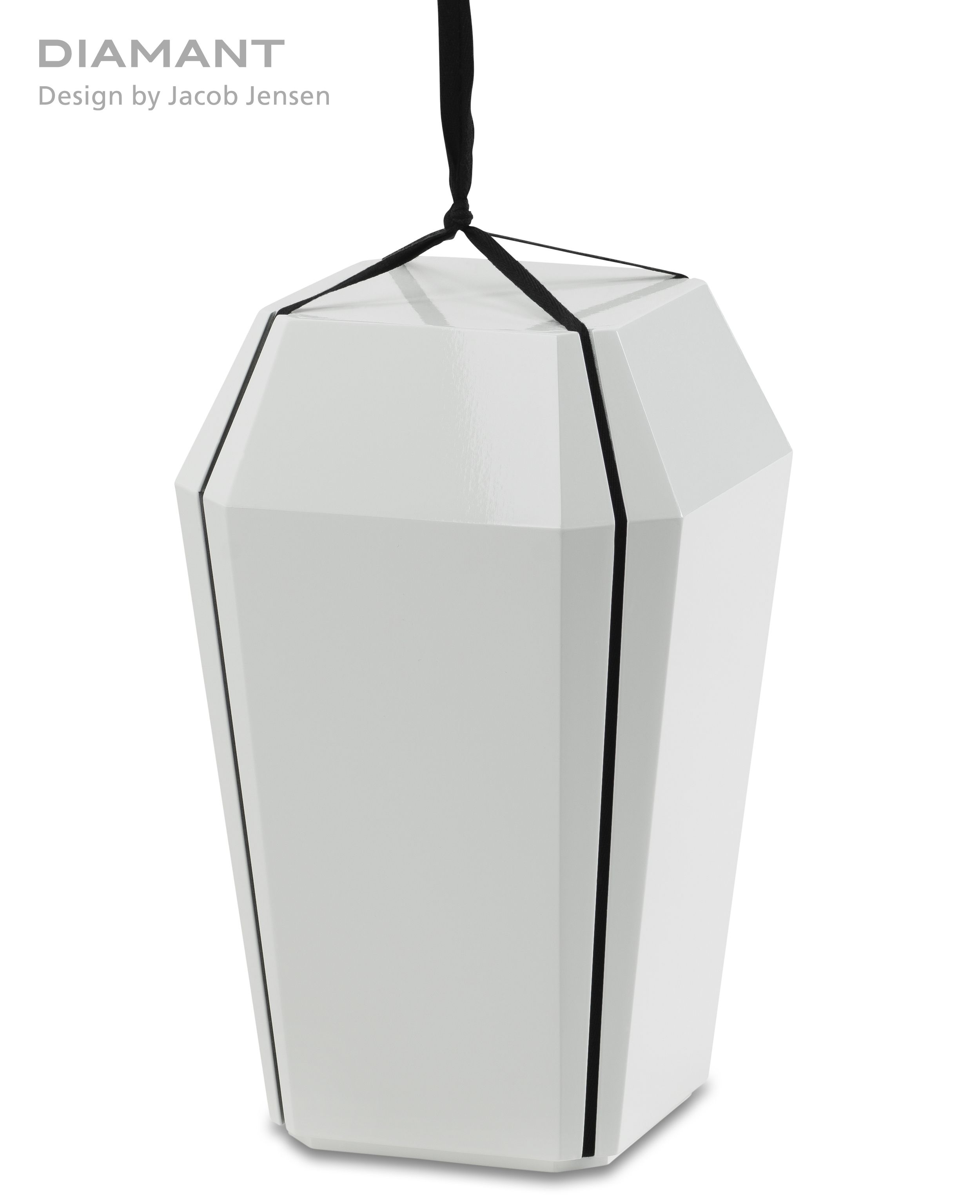 Urna av björkträ målad i högglans i färgerna rött, svart och vitt. Förgängligt material.
