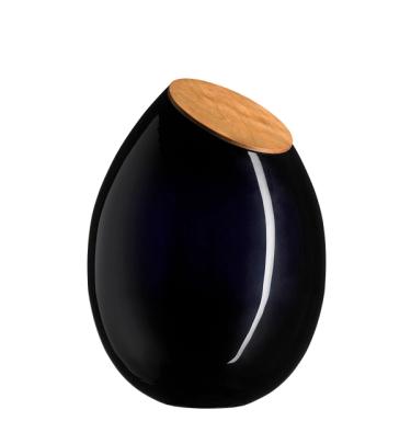 Munblåst beständig glasurna från Målerås glasbruk. Locket utgörs av en träplatta i körsbär. Varje urna är handgjord och synliggör en lång tradition av småländskt hantverk.