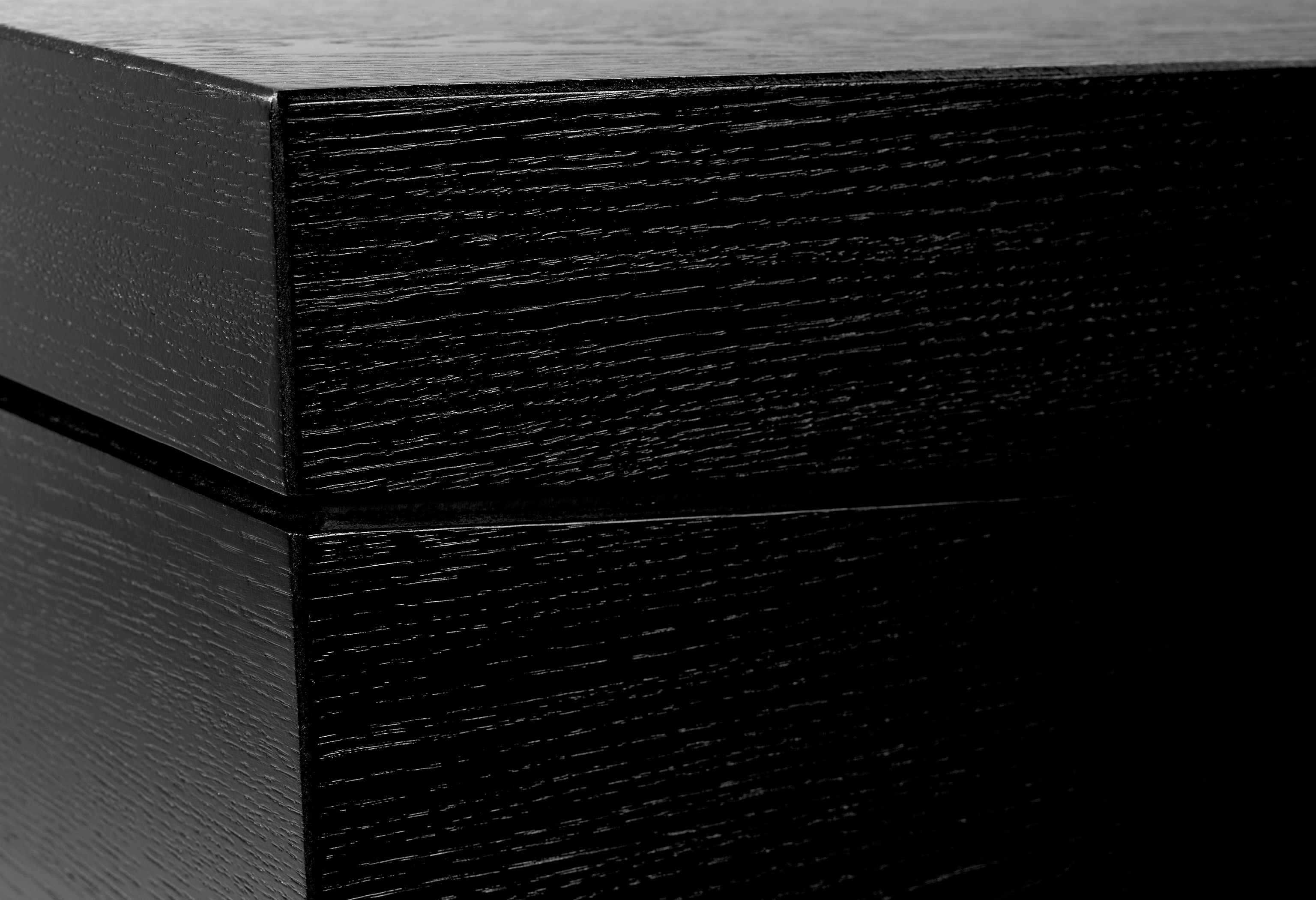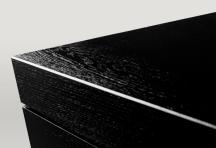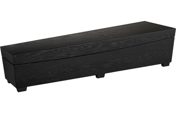 Stilren och modern kista tillverkad av ekfanérad träfiberskiva. Konformad med dolda handtag. Madrass, underlakan och slätt täcke med överlakansflik och kudde. Lock- och sidoklädsel i tyg.