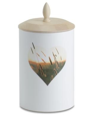 Tillverkad av mdf och papp med lock i massivt trä. Finns med motiven hav, ros eller sommaräng. Förgängligt material.