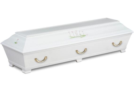 Vitlackad kista med vackra handmålade motiv av Linnéa. Inredning bestående av av kudde och täcke med överlakansflik i linnekvalitet. Madrass i nonwoven-textil. Lock- och sidoklädsel i bomullstyg.