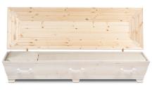 Stilren massiv kista i furu med passande läderstropp. Tyginredning i form av