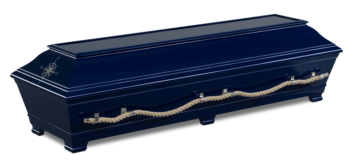 Vacker kista med marint tema, lackad i en djupblå färg. Invändigt har kistan ett klätt lock och är utsmyckad med stilrena dekorband i matchande blå nyans. Tyginredning i form av madrass, kudde och täcke med överlakansflik i bomull. Sidoklädsel i tyg.