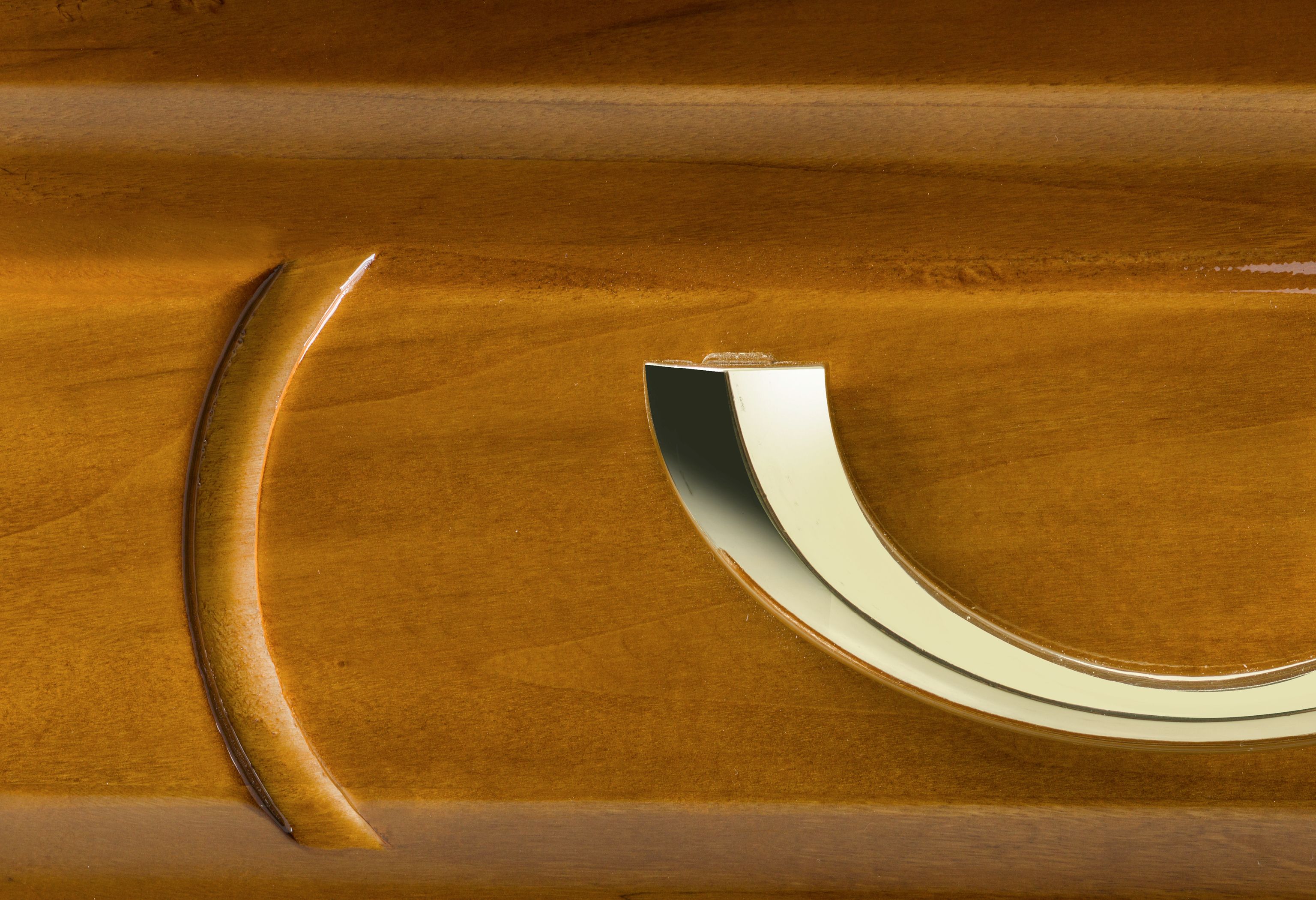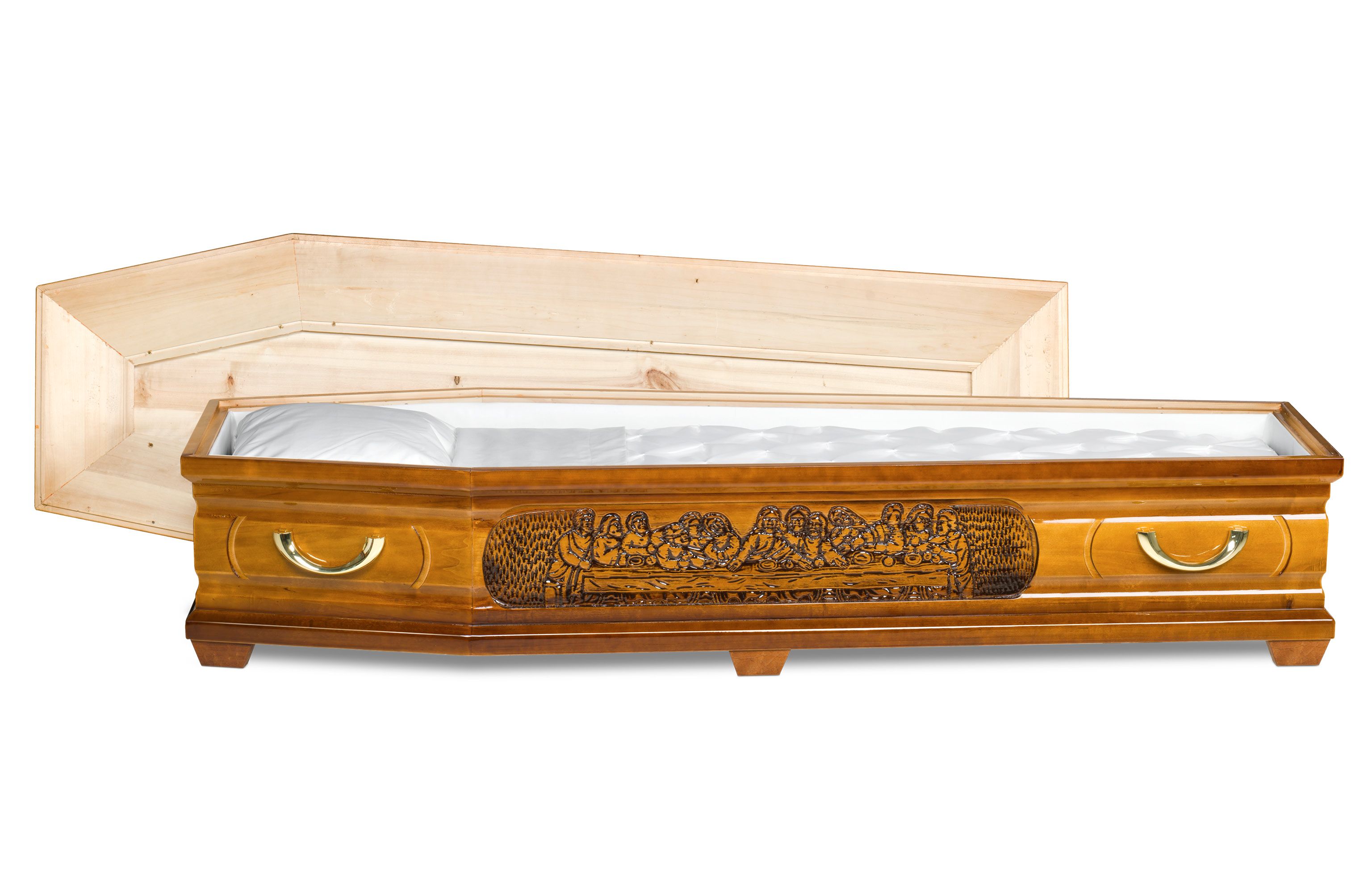 Kista i Poppel med utfräst motiv av Jesu sista måltid. Arbetad kista med vackra detaljer och eleganta guldfärgade metallhandtag. Tyginredning i form av madrass, kudde samt klassiskt noppat täcke med överlakansflik i bomull. Oklätt lock.